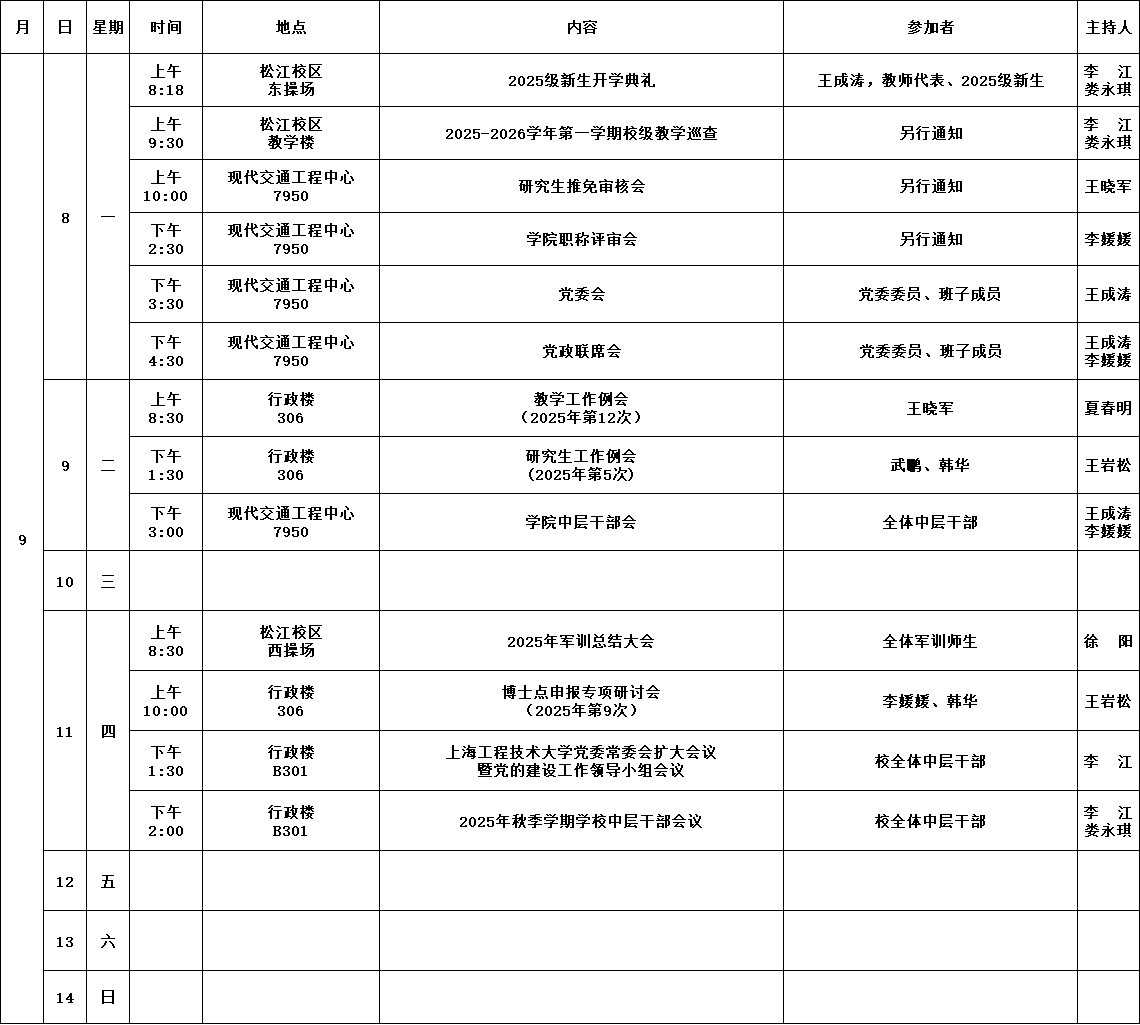 公司第1周活动安排(2025年9月8日-9月14日)