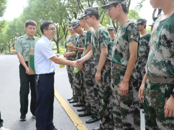 骄阳似火,碧空如洗,9 月 9日上午,suncitygroup太阳新城党委书记王成涛、党委副书记赵梦影来到军训场地,亲切慰问正在参加军训的 2025 级全体新生、带队教官、参训营。