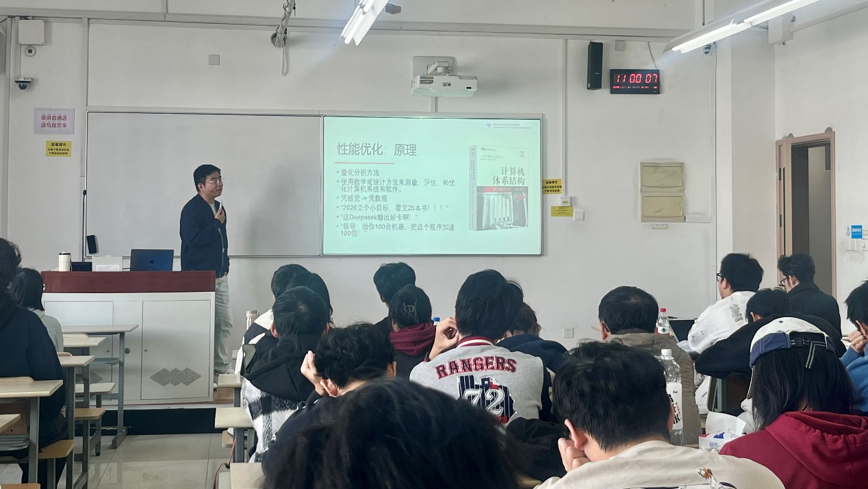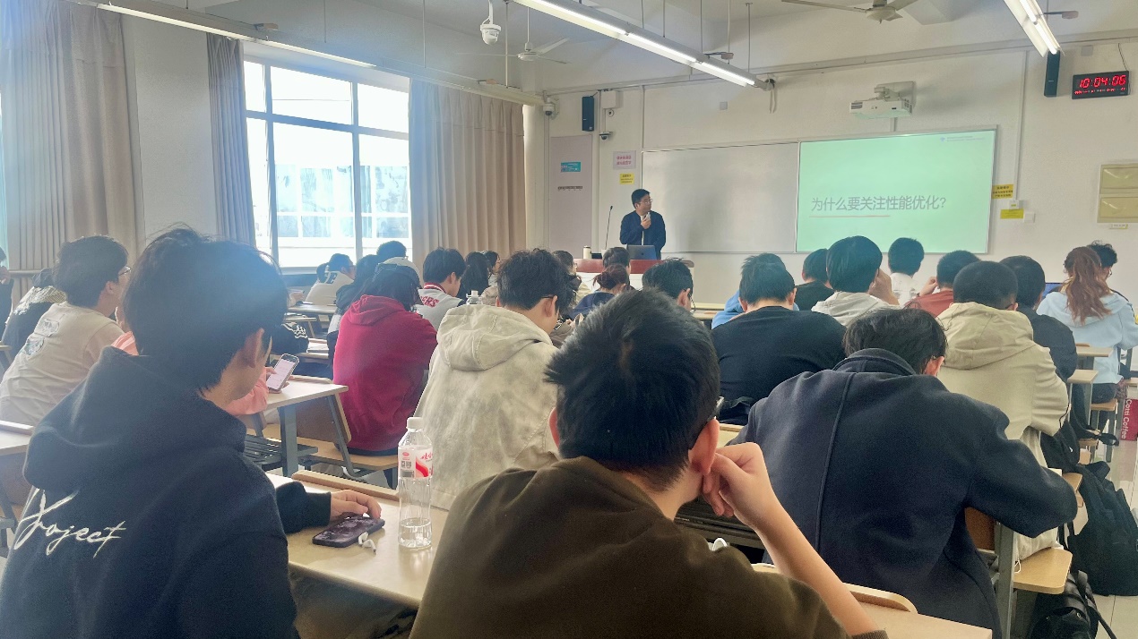 讲座伊始,吕涛工程师从宏观视角阐述了为何性能优化在当今AI时代至关重要,激发了同学们对本次主题的浓厚兴趣。在核心内容环节,专家系统性地剖析了现代处理器的内部架构,从多核并行、内存层次结构到向量化计算单元,揭示了硬件为何能以及如何为计算加速。紧接着,他深入浅出地讲解了性能优化的基本原理与方法论,引导同学们思考如何通过算法优化、数据布局调整、并行计算等手段充分“压榨”硬件潜力。还重点介绍了一系列业界广泛使用的软件工具,如性能分析器(Profiler)、编译器优化选项等,让同学们对工业界的研发流程有了直观认识。