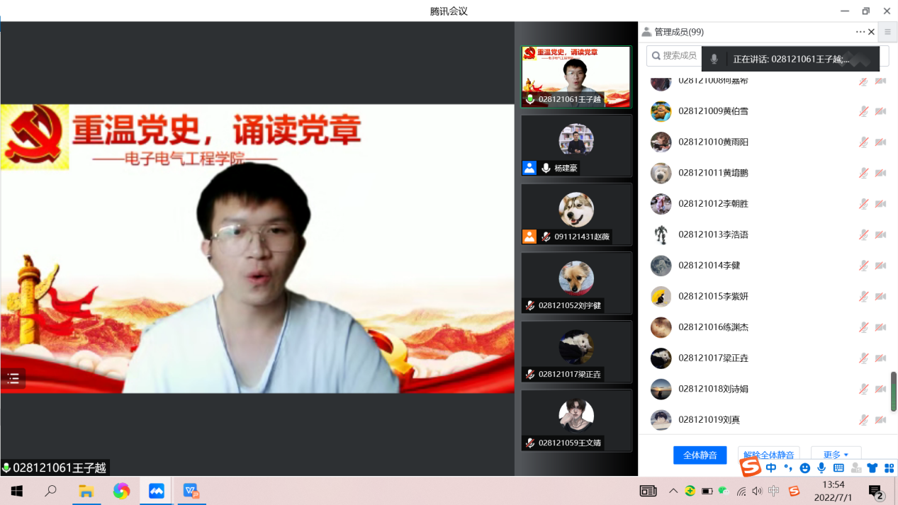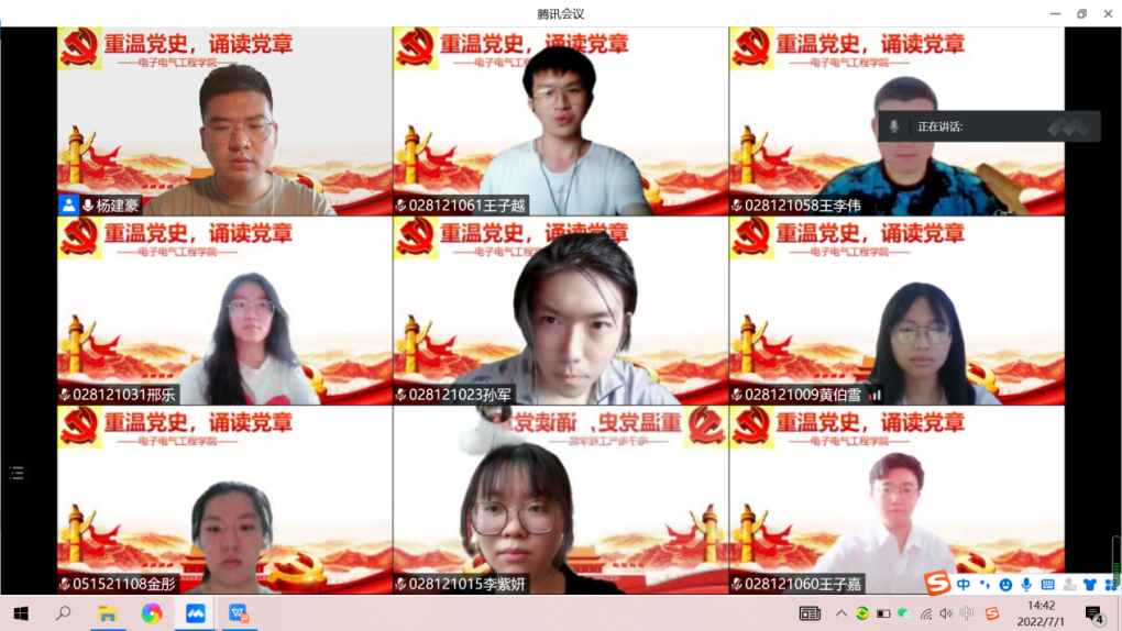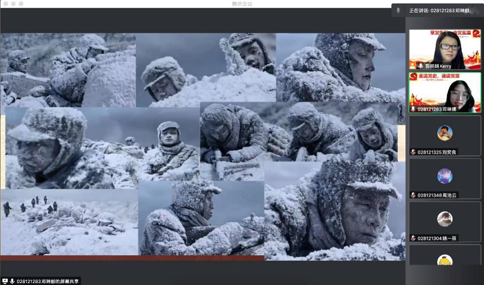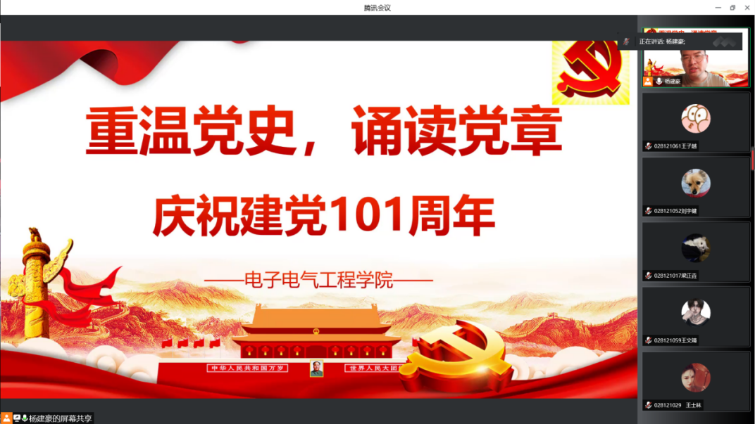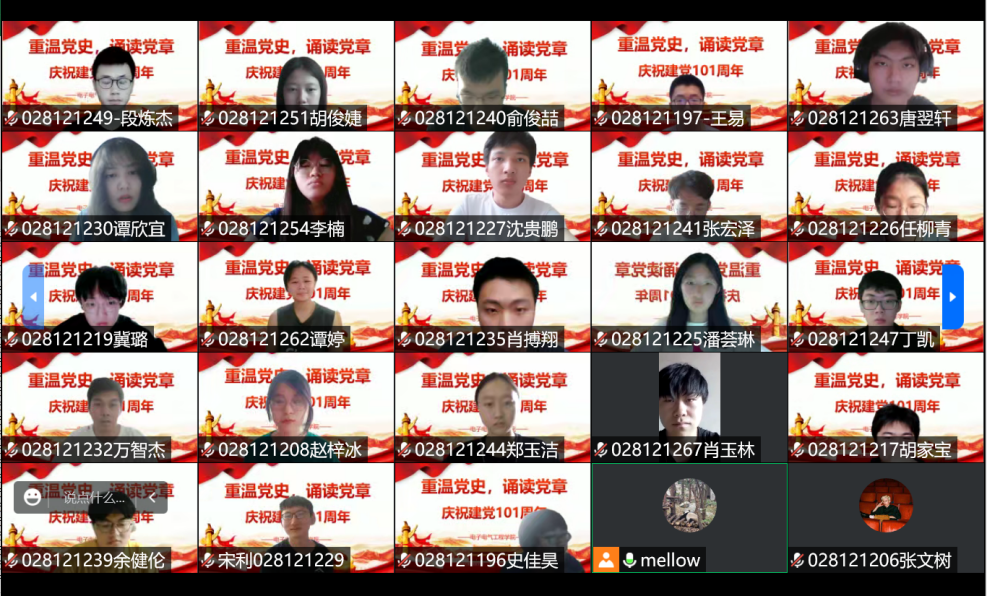 坚定理想信念,弘扬建党精神。在学院副书记赵梦影老师的要求下,公司本科生2021级五个军训班级分为五个分会场,同步开展线上党团活动,各分会场由班级带教老师主持。活动伊始,各班带教老师先向同学们介绍了建党节的由来,党章的重点内容,同时围绕“坚持真理、坚守理想,践行初心、担当使命,不怕牺牲、英勇斗争,对党忠诚、不负人民”的伟大建党精神,向全体受训同学开展了一次微党课。