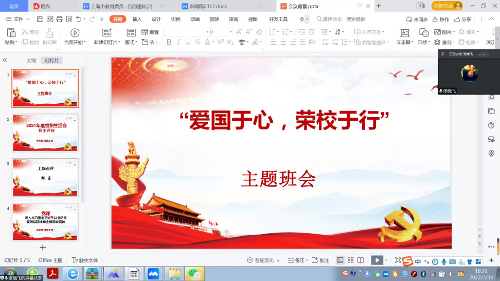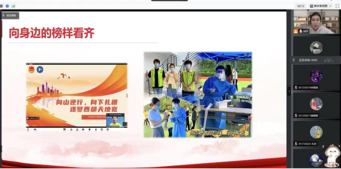 展爱校情怀,担荣校使命。2021级研究生主题班会中,辅导员表扬和感谢了疫情期间,研究生二年级党员和志愿者们的辛勤付出,他们疫情期间正是在用自己的实际行动表达爱国爱校之情。更提出,作为新时代青年,应该怀揣一颗爱国的心,肩负使命,行动起来,用所学的知识为祖国服务、为人民服务。