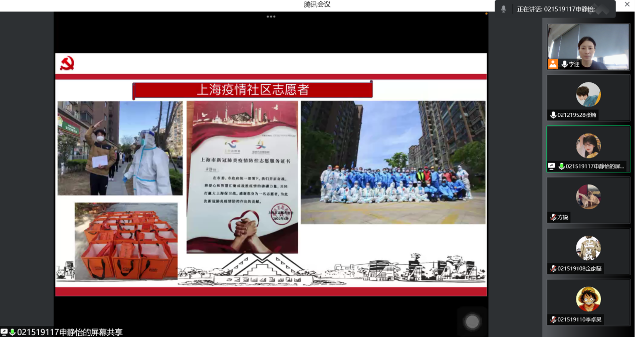 2019级本科主题班会邀请了自动化专业的张楠同学和广播电视工程专业的申静怡同学,从抗疫难忘故事、暑期计划安排、实习提升自我、考研备战复习等角度进行经验分享。张楠同学讲到,本学期疫情期间,班级同学们团结互助、共克时艰,积极参加并配合疫情防控工作,并荣获“最美抗疫班级”是大家一起努力的见证。同时建议大家充分利用暑期时间,制作简历找实习、进行考研和考公备战等,都是“做功课”的绝佳时期。申静怡同学从进博会志愿服务的工作娓娓道来,讲述了疫情期间参加的社区志愿服务工作,再到现在通过学院的就业推荐正在进行实习,这一路的历程让自己从思想觉悟到实践能力都得到极大提升。特别是现在,从象牙塔走上实习岗位,其中的个人角色和思维方式发生了很大变化,同时开阔了眼界,为后续真正选择就业岗位积累了经验。