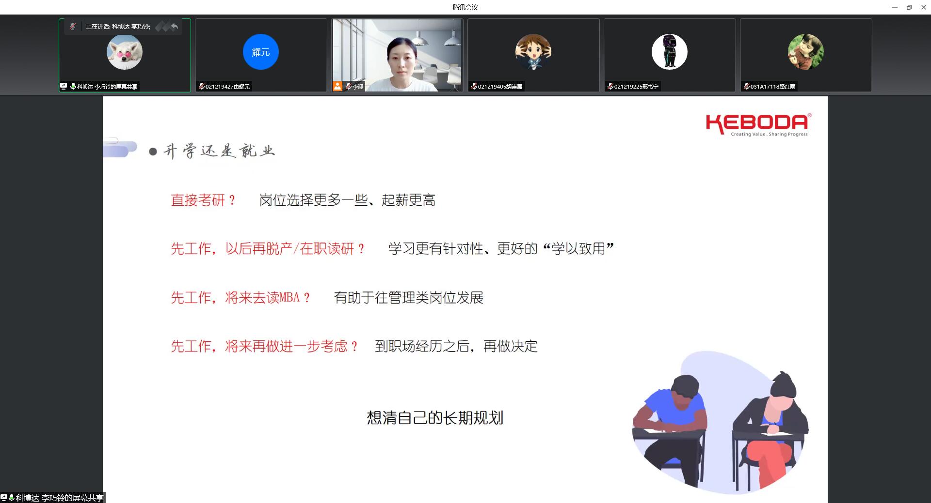 会议伊始,主讲人就升学还是就业点题,引导同学们思考先工作还是先考研,对长远规划引发思考。